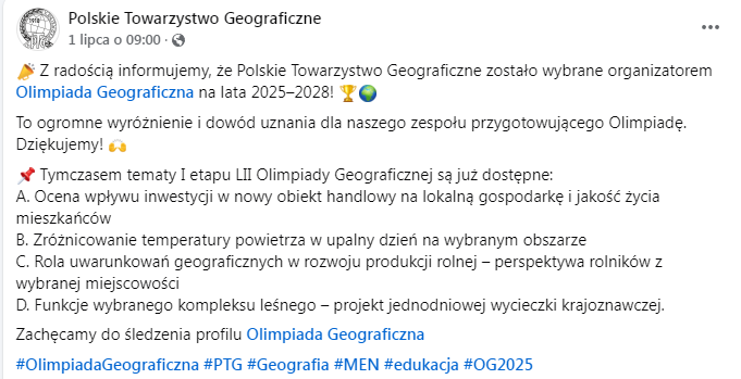 1 lipca 2025 r. Polskie Towarzystwo Geograficzne poinformowało o wygraniu konkursu na organizację kolejnych trzech edycji Olimpiady Geograficznej, tj. w latach 2025-2028. Już po raz 52 PTG będzie organizatorem najważniejszego konkursu geograficznego w Polsce. Przy okazji ujawniono tematy prac badawczych pierwszego etapu.